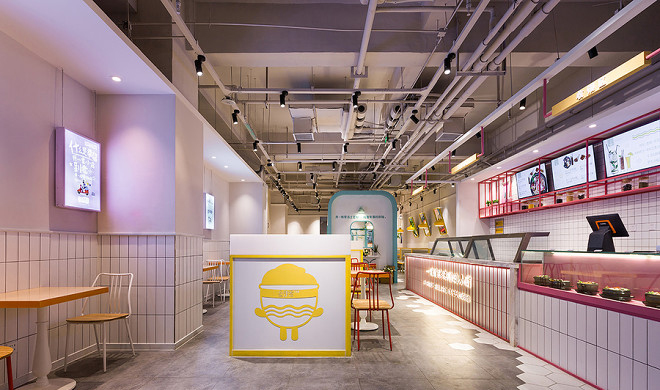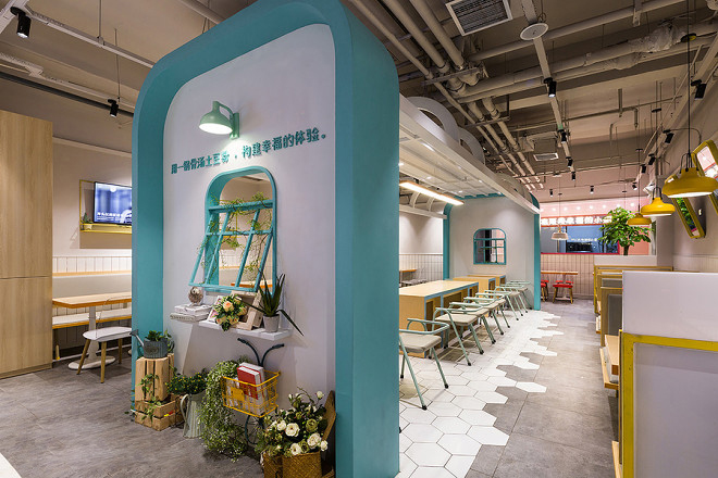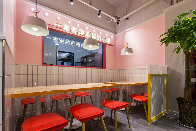 與餐館入口處區(qū)白色及藍(lán)色所構(gòu)建的自由空間相比,餐館內(nèi)充滿了激情與愛。踏入餐館,吸引人眼球是清新少女范迸發(fā)的餐館服務(wù)臺(tái),白色塊體與粉色系列的運(yùn)用,令人卸下一切疲倦,帶上一顆愛你的心來就餐。光亮的燈光與餐椅表達(dá)了餐館品牌對(duì)生活的態(tài)度。以原木構(gòu)建的餐桌,悉心構(gòu)建的燈光點(diǎn)綴在其中,用類似色的單體來分隔餐館的每個(gè)區(qū)域呈現(xiàn)。有時(shí)年輕活力,有時(shí)熱情奔放而清新少女范,這些是由不同的色彩方案來構(gòu)建。每一個(gè)色彩都來自于餐館與客戶的溝通。 |