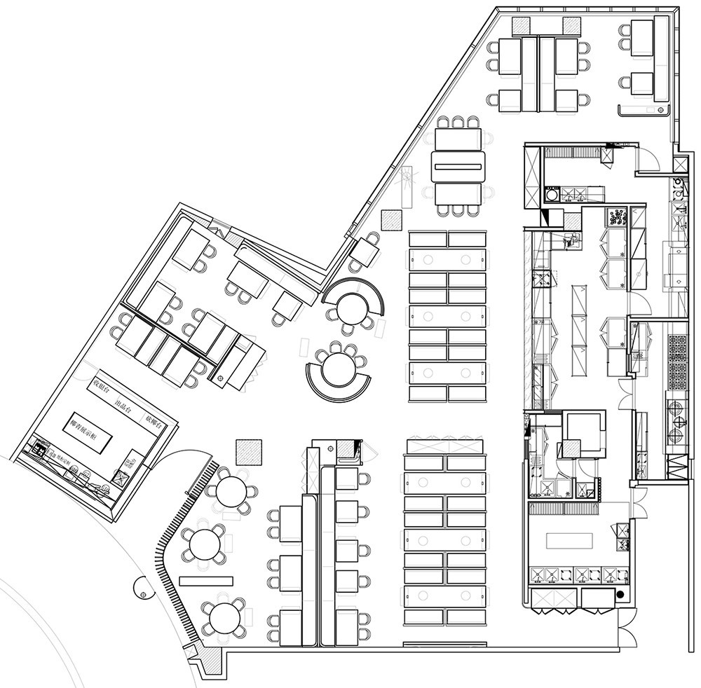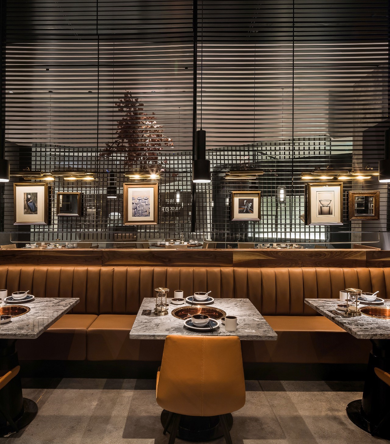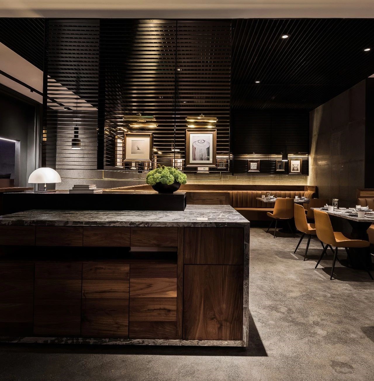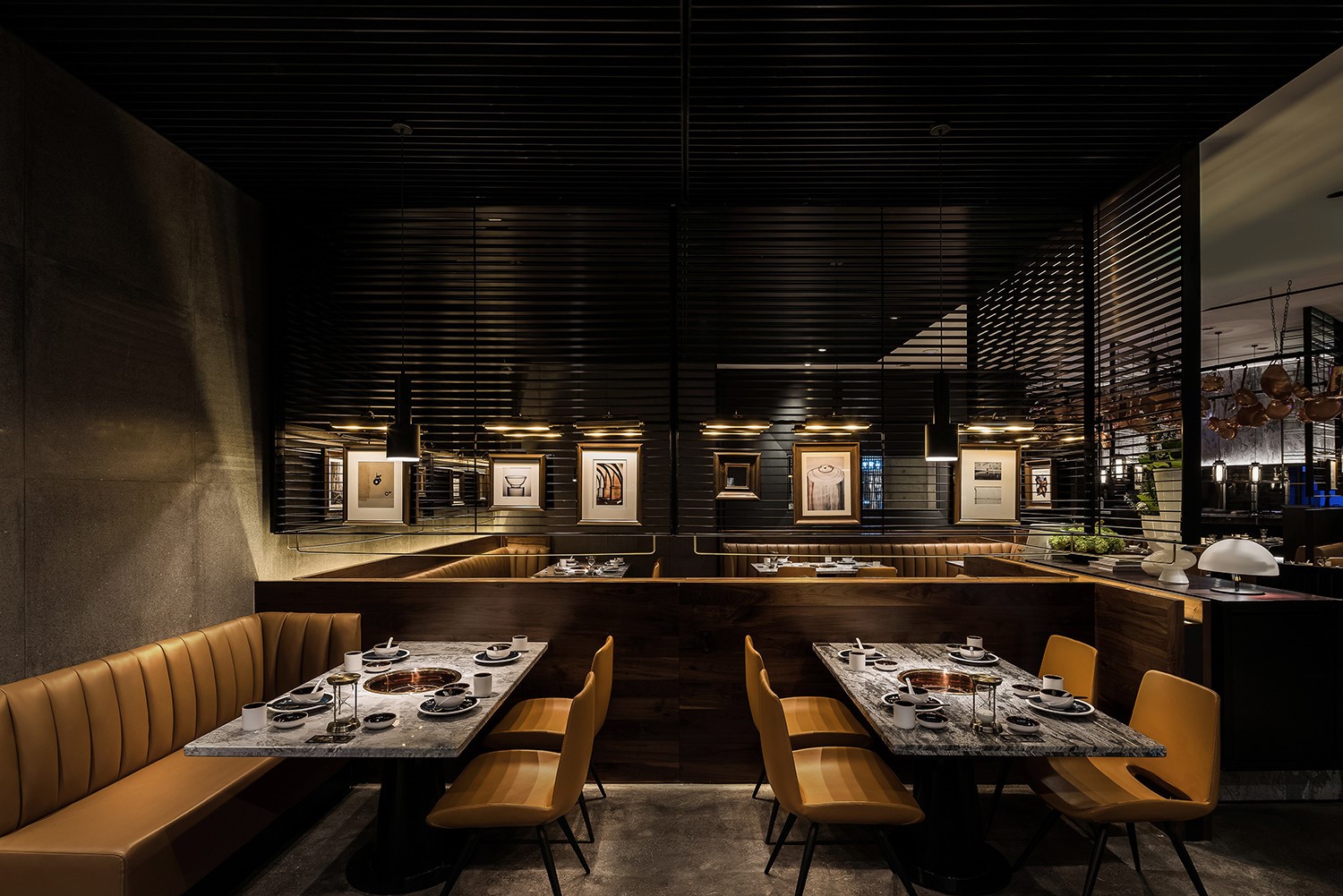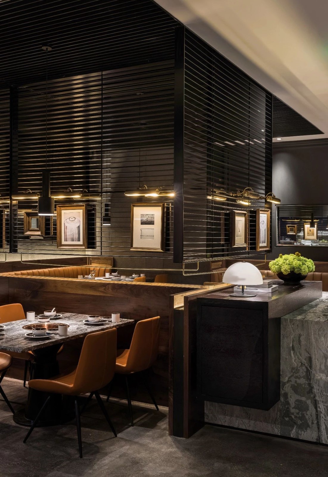 為了營(yíng)造美食與藝術(shù)碰撞的氛圍,設(shè)計(jì)師引入藝術(shù)陳設(shè)的設(shè)計(jì)概念?;诤?jiǎn)約設(shè)計(jì)的原則,設(shè)計(jì)師用樸素的材料和精致干練的造型賦予該項(xiàng)目全新的空間體驗(yàn)。只有將食材色彩兩者最大限度融合的地方,才能給人以“食”之最高享受,設(shè)計(jì)置換了櫥窗展示手法來(lái)展示餐廳的特有文化。大廳空間置入懸浮屏風(fēng),圍合出不同的就餐區(qū)域,每個(gè)就餐區(qū)域間隔而有透,讓食客的視線在整個(gè)空間中游離。加上黑色不銹鋼的裝飾,令空間增添高貴典雅的氣派。自成一體的黑鐵+木質(zhì)不再是簡(jiǎn)單的陪襯,反而與皮布家具爭(zhēng)奇斗艷,不同主題掛畫(huà)豐富了空間的藝術(shù)氛圍,讓食客在就餐體驗(yàn)如同置身于美術(shù)館。調(diào)動(dòng)食客身上每一個(gè)細(xì)胞,讓人們只想回歸于食色性也的本質(zhì),吃個(gè)爽快。既能讓食客專注的享用美食,又能在食客抬眼的瞬間感受藝術(shù)的魅力。 |