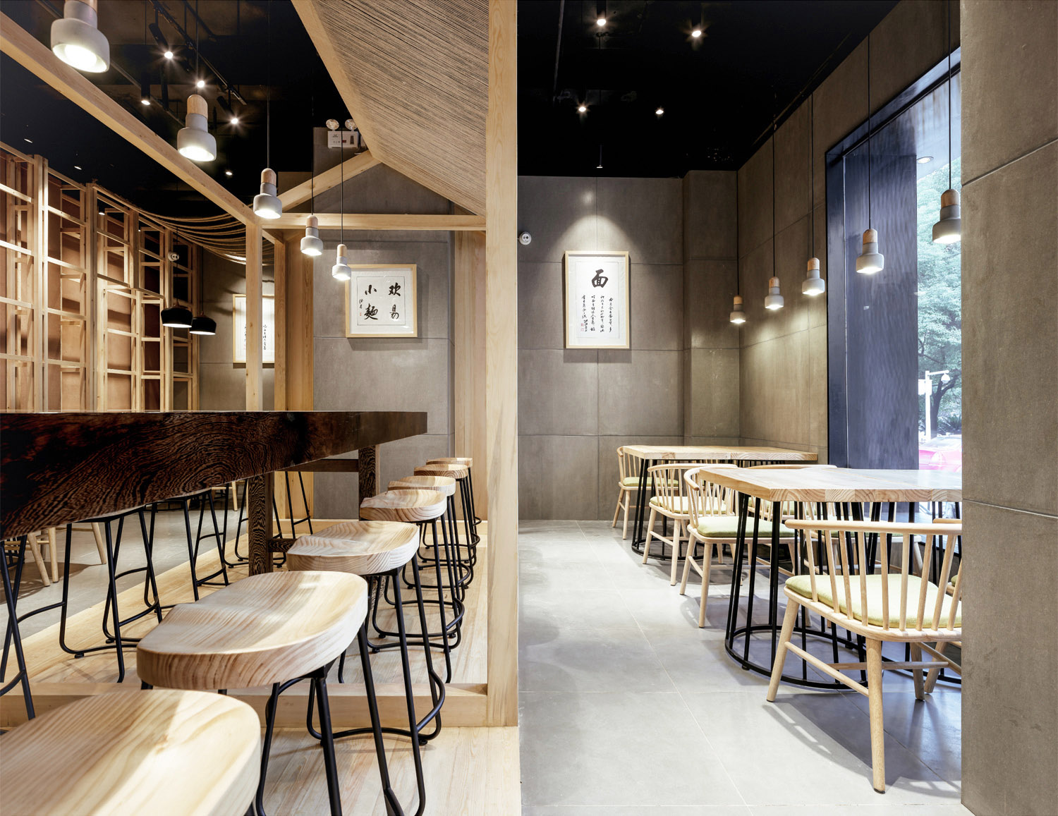 面館餐廳中設(shè)計師從制面的工具及流程一步一步提煉,?用現(xiàn)代的設(shè)計再一次詮釋了“?面”?及“?工具”?。店鋪運用原木色樟子松木和灰色青巖水泥板,?從遠處初見如格柵似的的木作外觀,?到再一次很近的距離用餐時,?木作的折射光產(chǎn)生柔和清靜的環(huán)境。墻頂穿插著細麻繩線現(xiàn)外觀上平整的線條,?隱隱約約著密境。門頭招牌部分,?墻壁運用了樸素米色真石漆和由地面延展至墻頂?shù)哪秃蜾??另一方墻頂運用“?搟面杖“?的原木裝飾設(shè)計構(gòu)造。 |