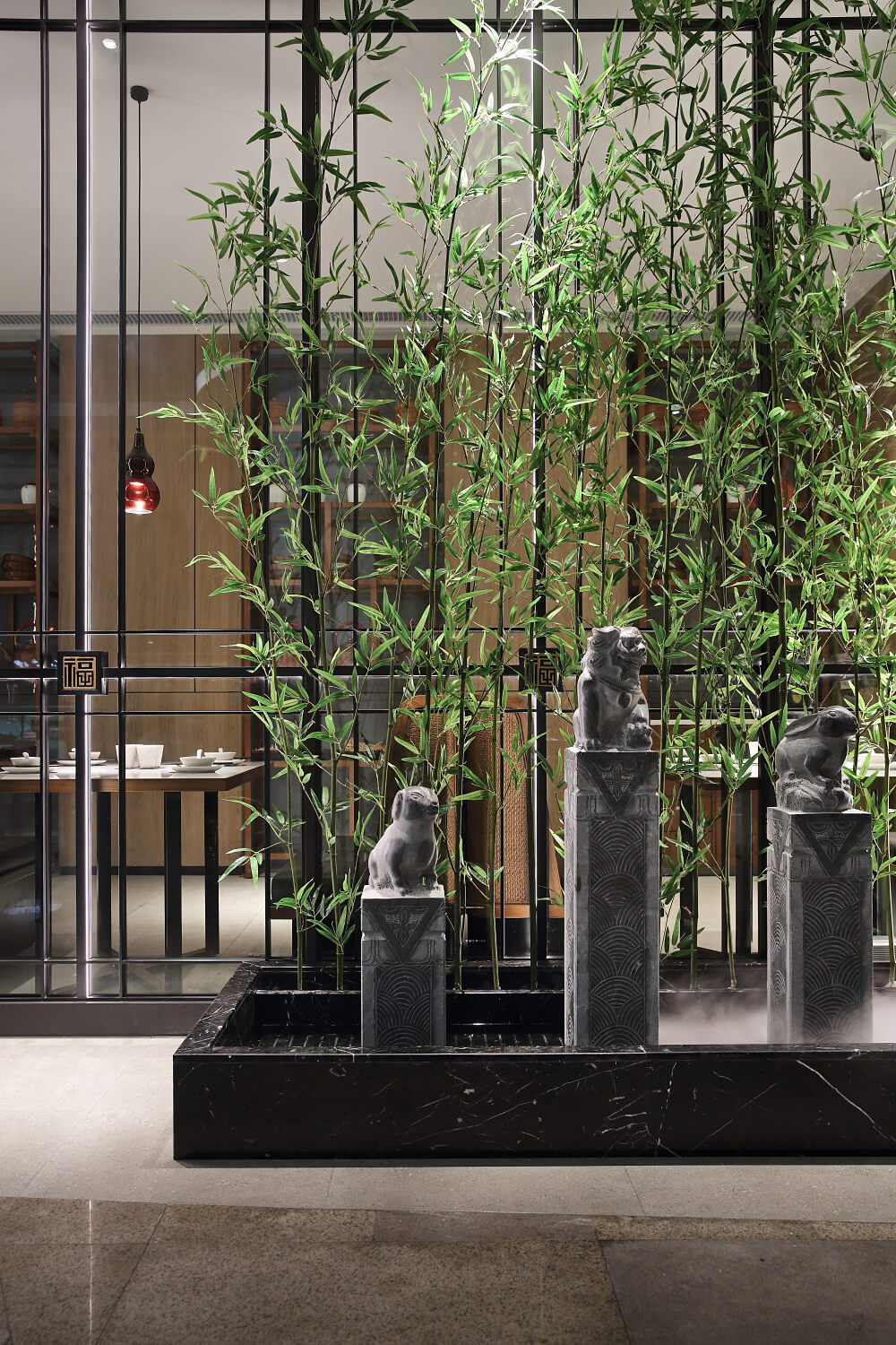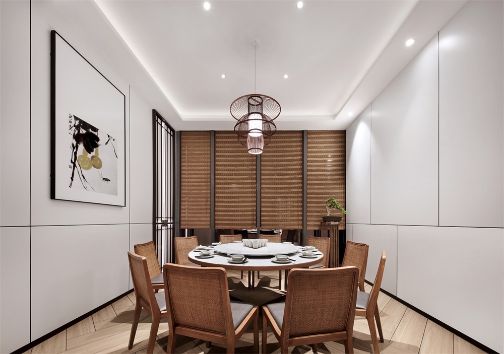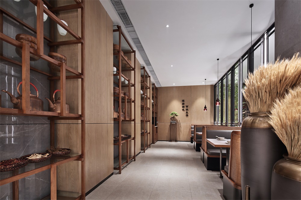 從該品牌理念下手,設(shè)計出本地古代建筑的標(biāo)志性拱形木結(jié)構(gòu)為空間框架,以福廚品牌理念為空間文化氛圍襯托。設(shè)計師用現(xiàn)代技巧詮釋福的概念,以純樸的材料創(chuàng)造簡約、精美、有溫度的就餐文化氛圍。此案門頭透明寬敞,加入靈秀的山水微縮景觀,右側(cè)有明檔呈現(xiàn)廚技,左側(cè)有拴馬樁和小片竹林。來到就餐區(qū),視角大開,優(yōu)雅的大理石背景墻配搭素凈的木質(zhì)餐椅,質(zhì)樸之風(fēng)蔓延在空間漫開,再配合藤編的裝飾,漫漫時光的纏繞,家的溫情感受霍然而出。 |