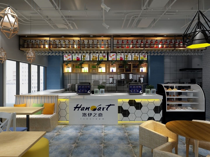 通過有點(diǎn)特色的桌椅板凳,凸顯店面的整體檔次。產(chǎn)品展示區(qū)及點(diǎn)餐區(qū),通過黃色暖燈想讓整理環(huán)境更柔和。吧臺選白色亞克力板讓整個店面更比較亮堂,簡潔大方。 |