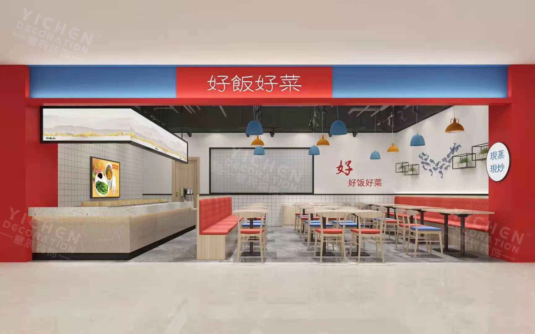 好飯好菜快餐店以“快”為第一準(zhǔn)則;室內(nèi)的設(shè)計裝飾要以簡潔明快為主,不需要過于復(fù)雜的空間造型設(shè)計和層次感營造,人們在快餐廳中停留的時間相對其他類型的餐廳來說是比較短暫的,因此快餐廳設(shè)置卡座區(qū)即可。一側(cè)桌椅靠墻排列,另一側(cè)服務(wù)臺靠墻設(shè)置。這樣可以有效的利用空間,使商家的利潤最大化。 |