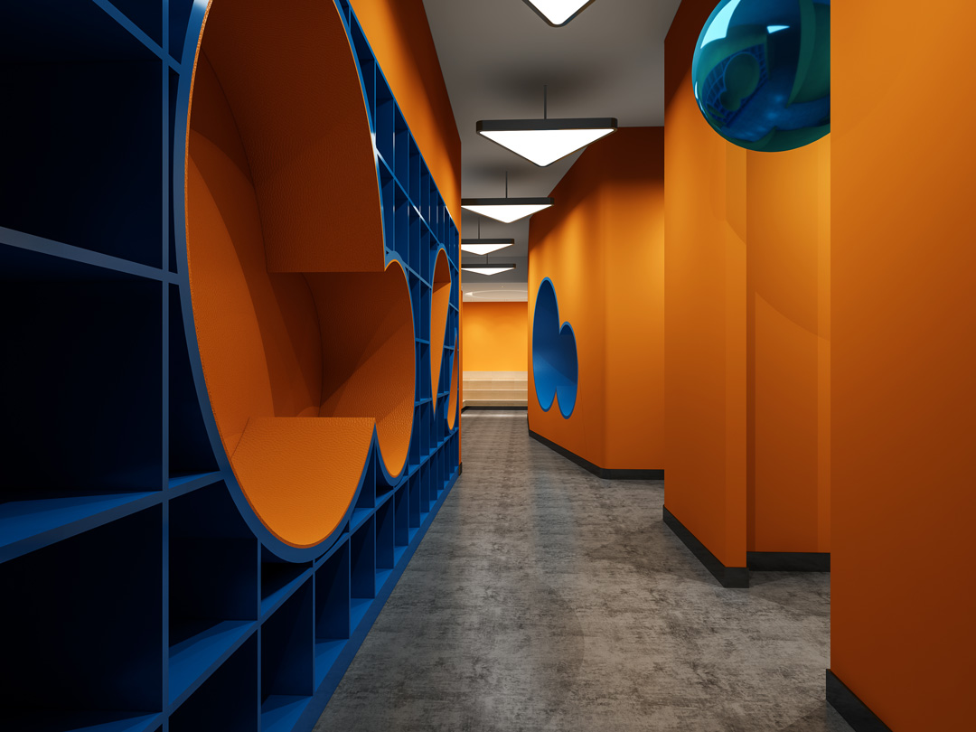 該兒童藝術(shù)培訓(xùn)學(xué)校裝修設(shè)計(jì)時(shí)定位為高端培訓(xùn),在色彩上,藍(lán)色可以讓孩子的視野更開闊,更能激發(fā)孩子的主動(dòng)思維,再加上橙色能讓孩子覺得更有希望和溫暖的感覺。 |
