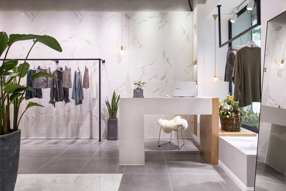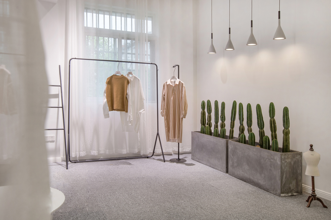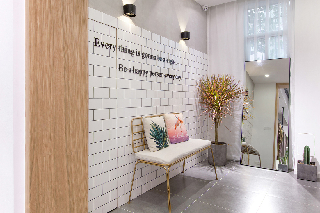 半夏女性韓裝店分為兩部分,一樓為服裝展示及試衣區(qū),二樓為會(huì)客休閑區(qū)。店鋪位于街道的邊緣地區(qū),在視角上是很容易被發(fā)現(xiàn),設(shè)計(jì)師以大面積的白色為基調(diào),擴(kuò)大店面的識(shí)別度,配以金色的廣告字,彰顯精致品質(zhì)。 |